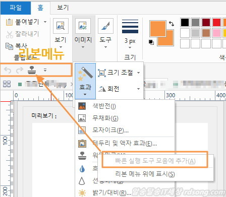 그런데 리본메뉴로 일일이 찾아가서 쓰려면 마우스 이동을 몇번 해야 합니다