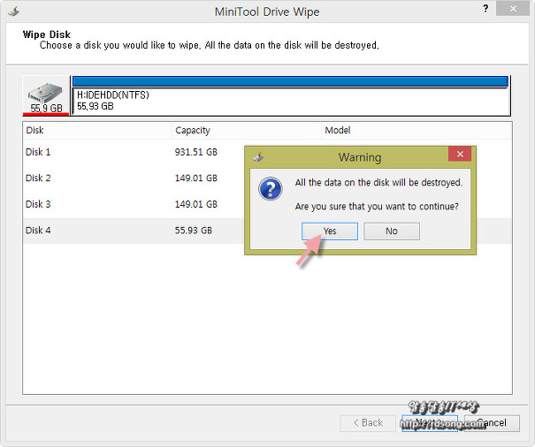 선택하고 next를 누르면 아래처럼 ,”모든 데이타를 영원히 날려버린다고 계속하겠느냐고” 메세지를 뿌려 줍니다
