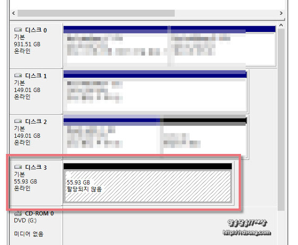 컴퓨터 관리의 디스크관리에는 보입니다,실행창에 diskmgmt.msc 입력하면 보이며 아래처럼 할당되지 않음 상태 즉 하드디스크의 구입시 초기상태로 된 거라고 보면 되겠네요
