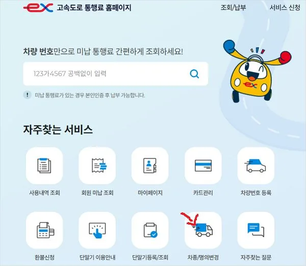 고속도로 통행료 홈페이지의 자주찾는 서비스 보면 아래 2곳 찾으면 됩니다.