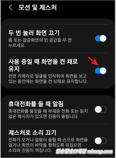모션 및 제스처 보면 , 스마트폰 사용 중일 때 화면을 켠채로 유지 : ON 켜주면 됩니다. 간단합니다.