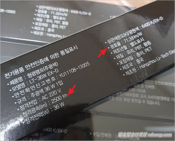 36W 형광등 정격광속 2500 lm (루멘) 광효율 71 lm/W ( 1W 당 71루멘 ) 색온도 6400K 가 있는데 구입할 때 여러 제품을 비교해 보면 정격광속이 높은 제품 일수록 가격이 조금 높습니다