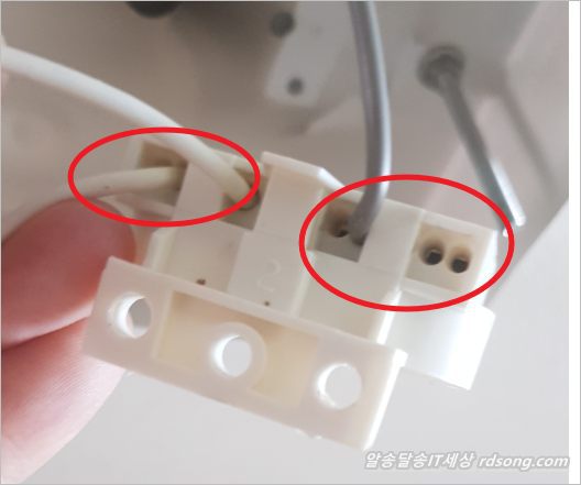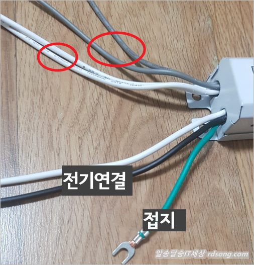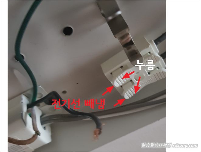 먼저 기존의 안정기 제거를 해야 하는데 전기선(흰색, 검정색) 2가닥을 먼저 전원 소켓에서 제거, 접지선 1개 제거 해주고 기존안정기 탈거 작업을 진행하면 됩니다