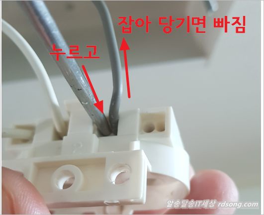 fpl소켓에 연결된 선을 분리할 때에는 한가닥 연결된 홀에 2개의 홀이 있는데 한쪽 홀에 송곳이나 다른 이쑤시게 ( 클립) 같은 것을 이용하여 홀에 끼워 준후 바로 옆선을 잡아 당기면 빠지게 되어 있습니다
