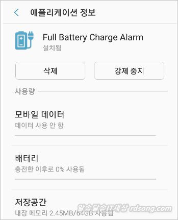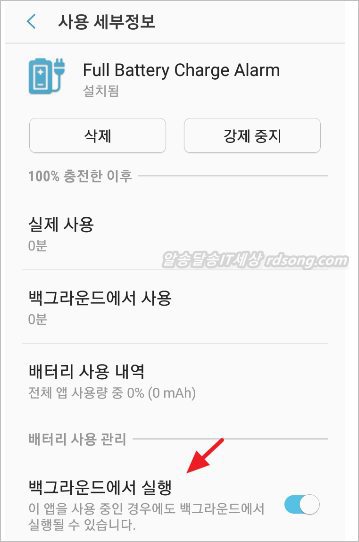 full battery charge alarm 앱의 스마트폰의 애플리케이션 정보에 가서 앱을 열어 보면 특별히 소유 권한도 없고 정말 심플하게 작동하는데 ‘ 배터리’ 를 눌러 보면 백그라운드에서 실행 활성이 되어 있습니다