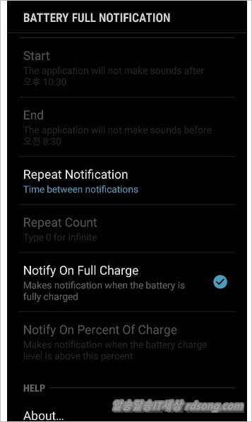 배터리 충전 완료 알려주는 어플을 설치하고 그냥 사용하면 됩니다 아무런 설정 옵션이 없습니다
