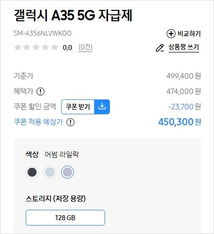 갤럭시 a35 가격은 45만원 정도 구입 할수 있으며 삼성 닷컴 쿠폰적용 되어 있는 가격 입니다. 조금 시간 지나면 오픈마켓에 올라 오게 됩니다.
