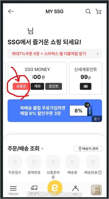 상품권 , 계좌, 포인트 나오죠 여기서 상품권 터치 합니다.