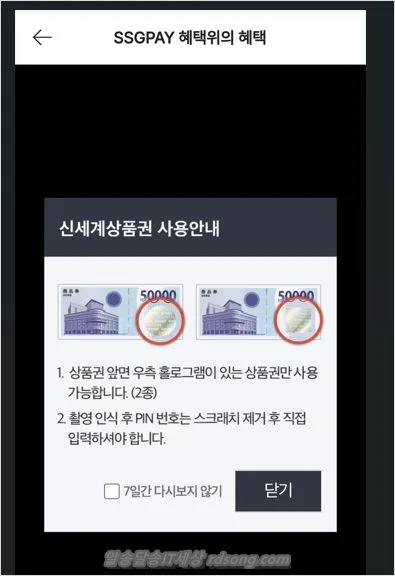 종이 신세계상품권 홀로그램 부분을 긁으면 핀번호 나옵니다.
