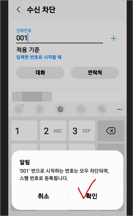 001 번호 시작되는 번호는 모두 차단되며 스팸번호 등록 됩니다 라고 나오네요 확인 하면 완료 됩니다.