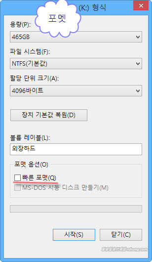 ▼ 문제가 있던 외장하드 였으므로 꼭! 빠른포멧은 체크 해제 합니다 볼륨레이블은 외장하드 라고 입력했는데 파악하기 쉽도록 입력하면 됩니다