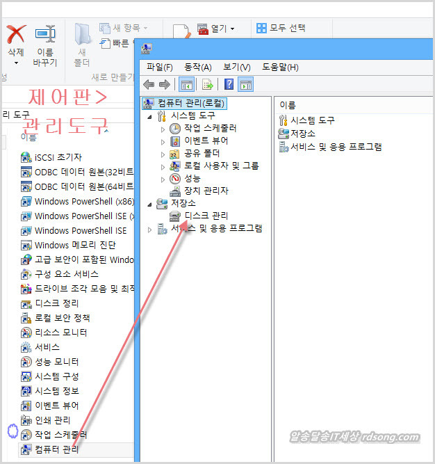외장하드 포멧 방법 , 제어판의 관리도구 컴퓨터 관리의 디스크관리