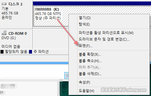 상당히 조심해야 하는데 외장하드 연결된 디스크를 찾아 빗금친 부분에서 마우스 우측을 눌러 포맷을 하는 겁니다