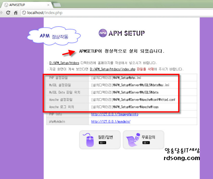 apmsetup7 이 제대로 설치가 되었는지 확인하는 단계로 웹브라우져 URL에 http://localhost/index.php 라고 타이핑하고 엔터때리면 아래처럼 apmsetup이 정상적으로 설치된 화면이 뜨게 되는데요