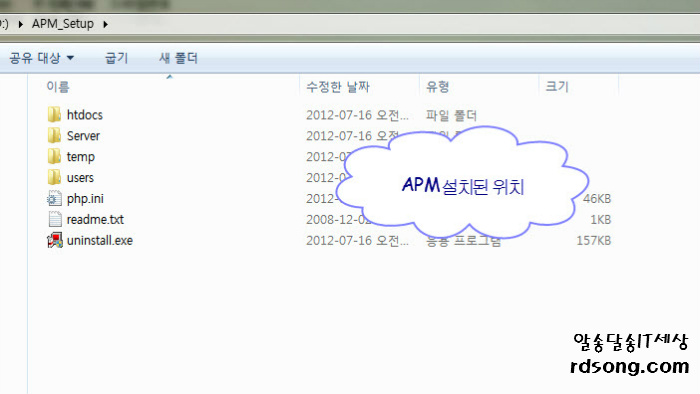 웹서비스폴더는 디폴트 c:APM_setuphtdocs 이며 , 제컴 윈도우7 설치된 경로는 D:APM_setuphtdoscs 로 잡았습니다