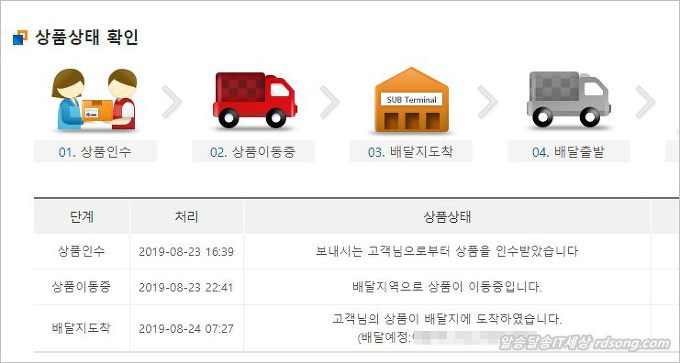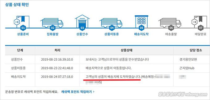 cj대한통운 홈페이지의 배송상태 결과를 알려 줍니다 배달지 도착.