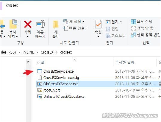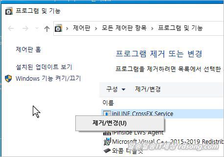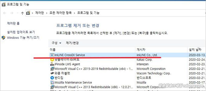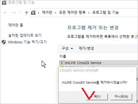 프로그램 및 기능 / 추가/삭제에서 삭제 하면 된다. iniline crossEX service 설치 되어 있는것 찾아 언인스톨 삭제 하면 된다.