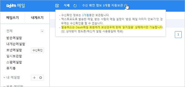 Daum메일 회원에게 보낸 경우 한해 ‘읽지않음’ 상태에서만 가능합니다.