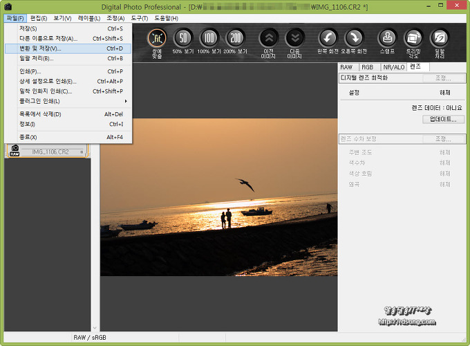 보정이 끝나면 다시 원래 파일인 cr2이미지 형식으로 저장도 되며, 변환 및 저장을 누르면 다른이미지 포멧인 jpg-jpeg파일로 변환이 됩니다