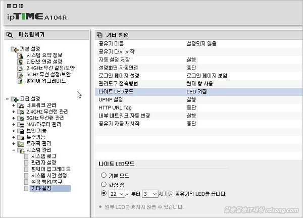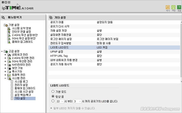iptime 유무선공유기 나이트 LED 모드 설정하여 공육의 깜박거리는 led 불빛 끄기