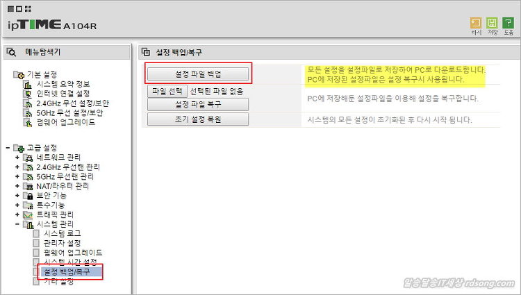 고급설정의 시스템관리에서 설정 백업/복구에서 설정파일 백업 ( 셋팅 된 상태 그대로 ) 를 cfg 파일로 저장합니다 저장하면 내 PC에 cfg파일로 저장하며, 다시 필요시에 불러들여 설정파일로 복구하면 됩니다