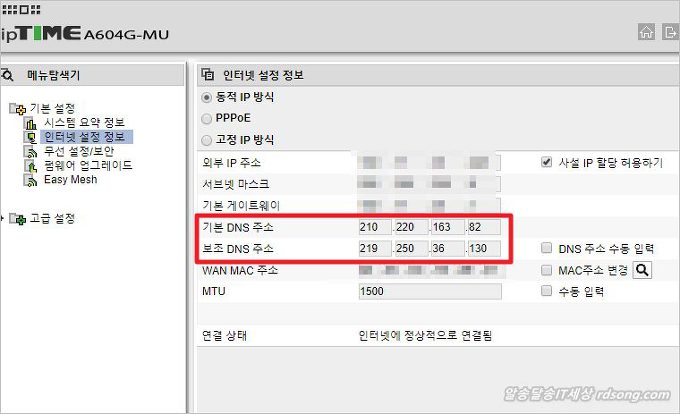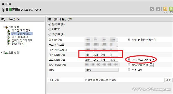 iptime 유무선공유기 기본 DNS 주소를 KT DNS 주소 변경