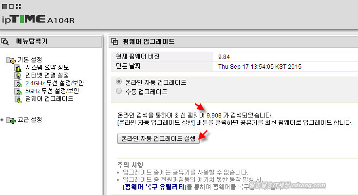펌웨어 업그레이드 메뉴에 최신 펌웨어 9.908 이 검색되며 [온라인 자동업그레이드 실행]으로 적용을 해주면 된다