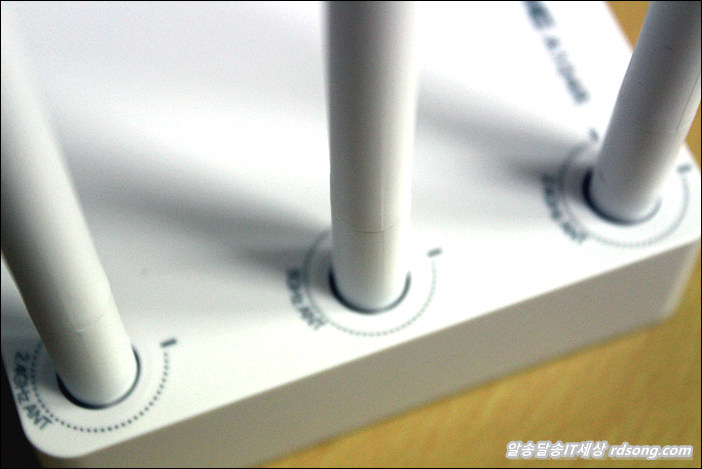 iptime A104R 802.11AC 유무선 공유기는 2.4ghz 안테나가 2개 중앙에 5Ghz 안테나가 1개가 부착되어 있습니다 점선구간이 안테나를 좌우로 이동 움직일수 있는 구간으로 적당히 조절하면 되고 그대로 세워두고 냅둬도 잘 됩니다