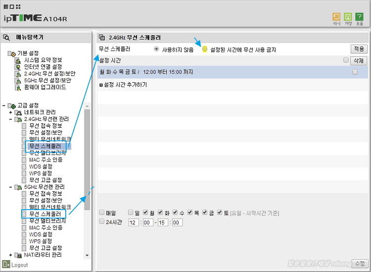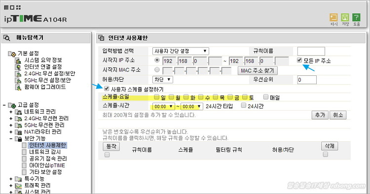 Iptime A104R 유무선공유기 시간대별로 인터넷 사용제한 걸기 및 와이파이 무선사용제한 하는 방법