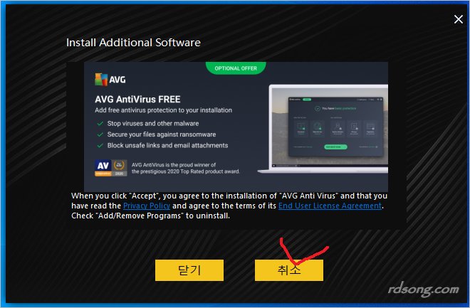 설치 하다보면 아래처럼 추가적 AVG 안티바이러스 FREE 설치 옵션은 취소 하면 됩니다.
