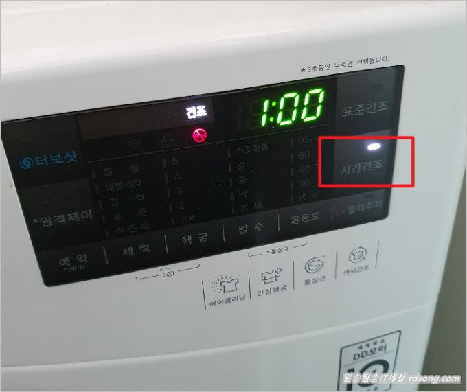 표준건조 있긴 하지만, 너무 오래 걸립니다. 드럼 속에 세탁물이 많다면 아무래도 시간 조절을 적당한 시간으로 선택 하고 사용해 봤습니다.