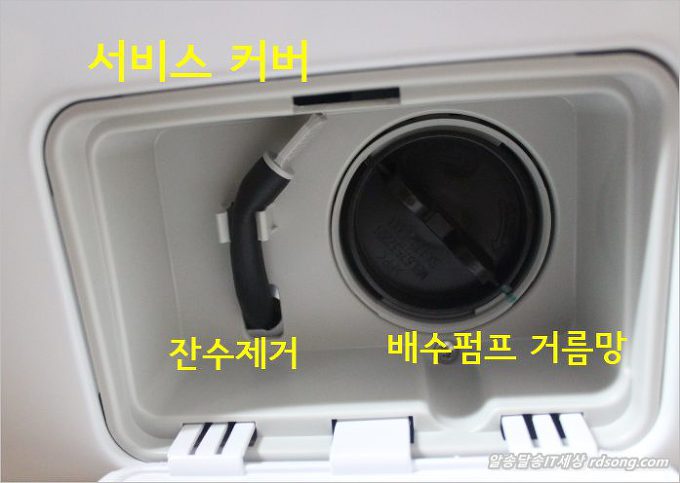 잔수제거 호스 있고, 배수 펌프 거름망 있는 곳으로, LCD창에 OE 또는 경고문구 뜰때 펌프마개 돌려 ,거름망 청소를 해줘야 한다고 설명서에 나와 있습니다.