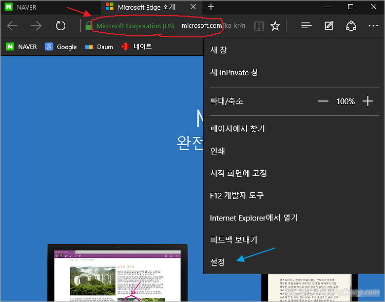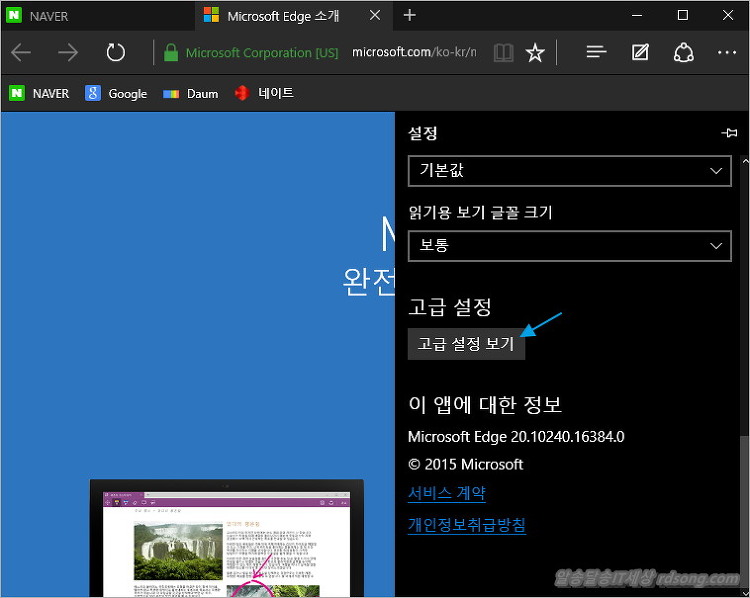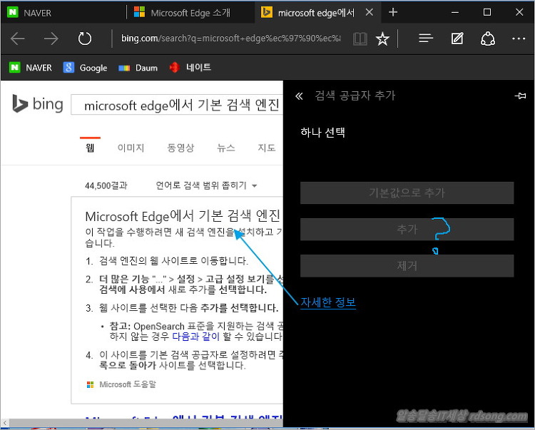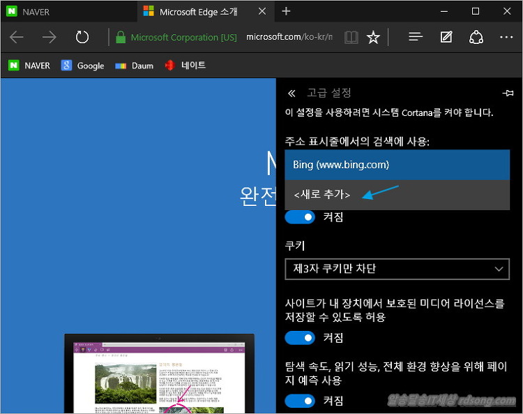 MS 엣지 (edge) 기본 검색엔진을 변경하는 방법으로 지금은 아마 모든 윈도우 10 설치후 기본 검색엔진이 bing (www.bing.com) 으로 되어 있어 빙(bing) 검색으로 검색이 되도록 설정이 되어 있는데요 네이버 다음 사이트로 기본검색엔진을 바꿔 보려고 했는데 어렵더군요