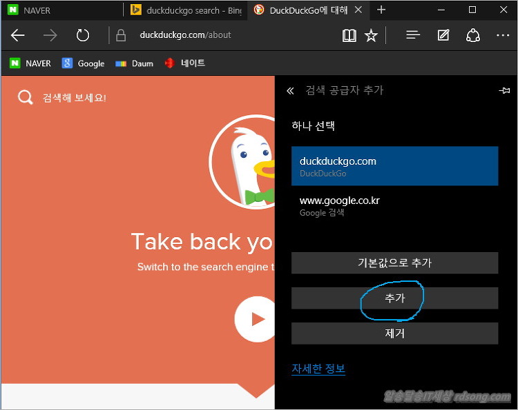 URL 주소창에 아래처럼 duckduckgo.com 으로 접속한 다음 확인해 보면 선택이 가능해 집니다 선택을 하고 만일, ‘추가’를 누르면 그냥 추가만 될 뿐 , ‘기본값으로 추가’를 선택해야 한번에 기본검색엔진이 바뀝니다