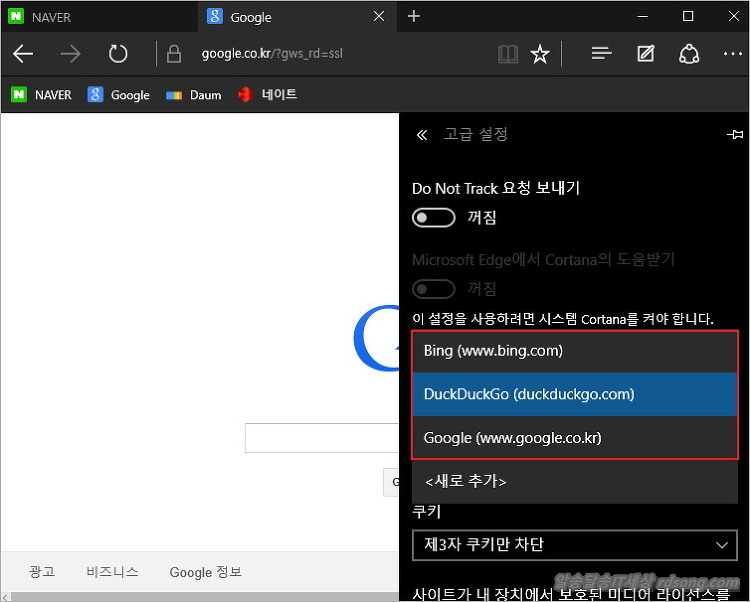 하여간 엣지에서 구글 홈피를 띄우거나 , 덕덕고 검색엔진을 웹사이트를 띄워 보세요