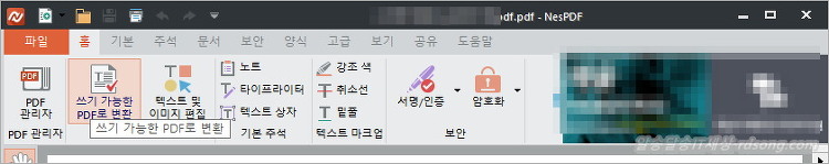 Nespdf에서는 pdf 수정(pdf editing)하는 기능이 있습니다 수정할 pd f파일을 열면 ‘쓰기 가능한 pdf 변환 에서 에디팅 기능을 제공합니다