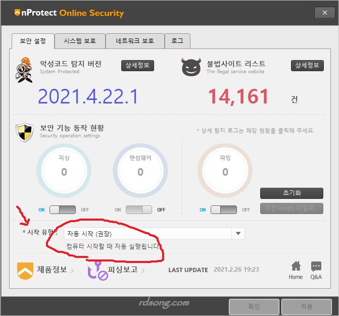 nprotect online security 시작유형 : 자동시작(권장) 을 수동방식으로 변경