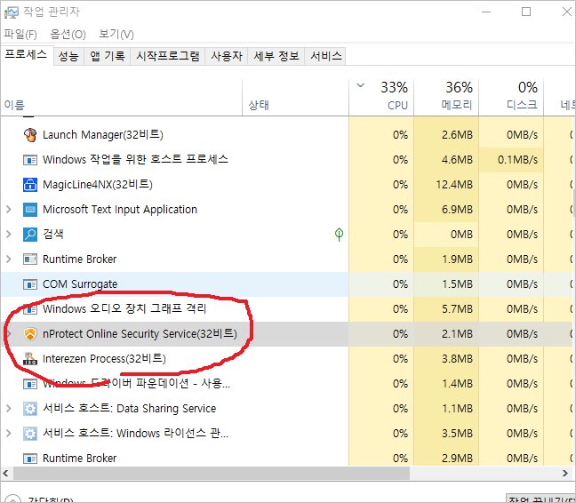 윈도우10 작업관리자 nprotect online security server (32 비트) 떠 있는데 위처럼, [ 자동시작 안함 ]으로 변경하면 작업관리자에서 사라집니다.