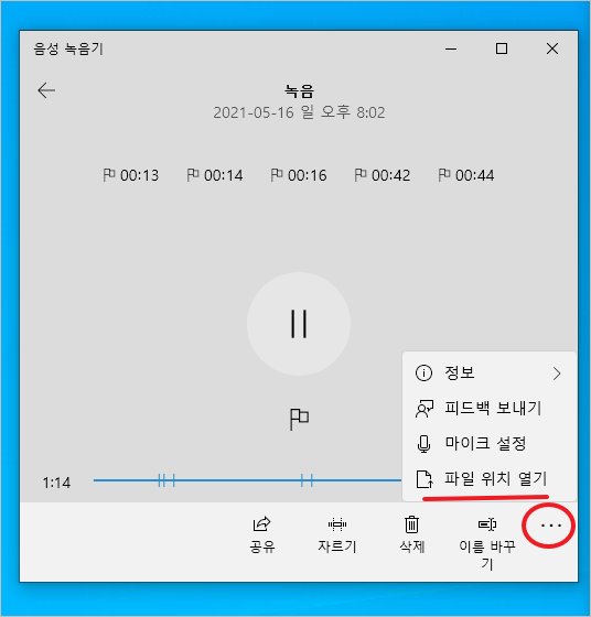 컴퓨터 소리 녹음 파일위치 어디에 있을까? 아래처럼 점3개 눌러, 파일 위치 열기 누르기 하면 음성 녹음 파일이 있습니다.