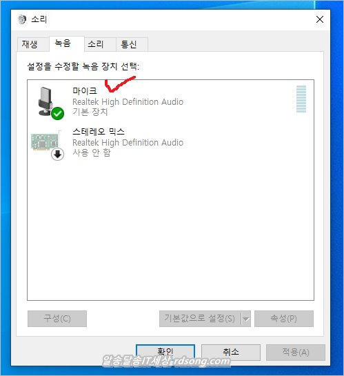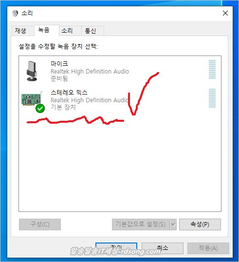 컴퓨터 녹음 기본장치 변경 : 마이크 to 스테레오 믹스