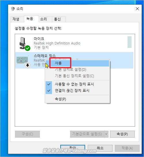 스테레오 믹스 위에서 마우스 우측 눌러 > 사용 선택을 합니다. 그러면 기본으로 바뀌게 됩니다. 스테레오 믹스 출력으로 녹음이 되게 하는 겁니다. 추가적으로 체크가 되면 반드시, 기본장치로 설정(D) 체크 해 줍니다.