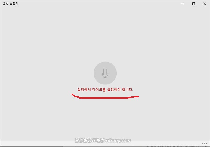 윈도우10 음성 녹음기 앱 열어 보니 , [ 설정에서 마이크를 설정 해야 합니다. ] 라고 나옵니다. 왜 그럴까? 우측 하단의 점3개 눌러 > 마이크 설정 갑니다.