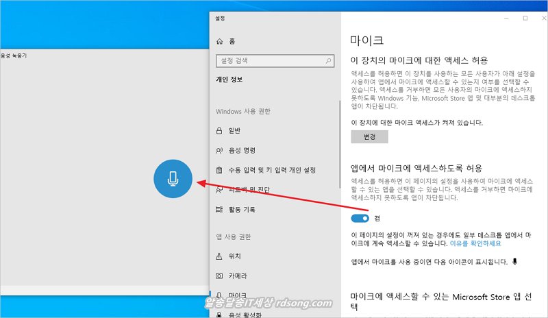 음성 녹음기의 앱 설정 에서, 앱에서 마이크에 액세스 하도록 허용 꺼져 있는데 켜 ON 줍니다. 그러면 메시지가 사라지고 정상적으로 아래처럼 마이크 녹음 아이콘 표시 됩니다.