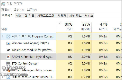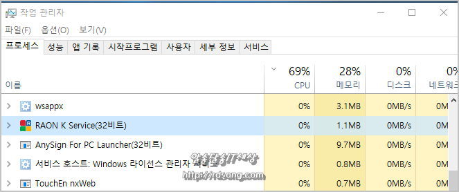 윈도우7 보니 Raonk.exe 가 작업관리자에 떠있는 듯 하다 다른 프로세서가 있을수도…!