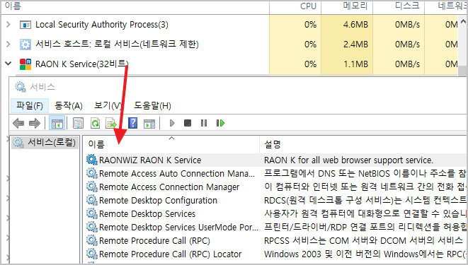 RAONWIZ RAON K service 를 마우스로 선택하고 클릭하여 서비스를 중지 해 봅시다