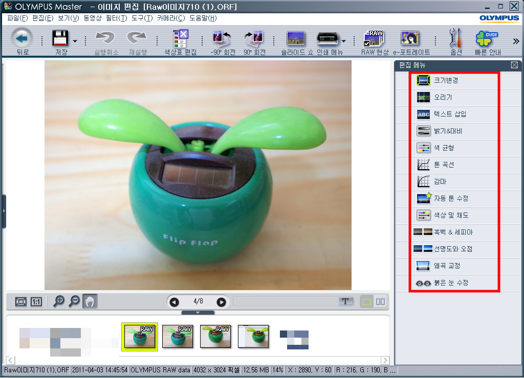 ORF 파일을 열어보니 일부 오류가 나기도 해서 불편해서 그냥 포기, 다른 RAW 이미지 파일을 열어 보시길…
