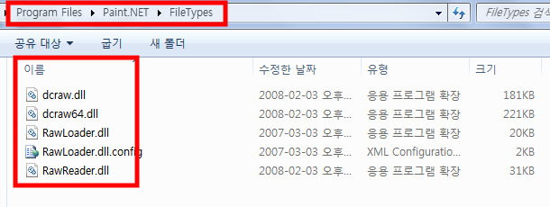 폴더에 dll파일을 복사해 주면 된다 인터넷으로 paint.net RAW 이미지 플러그인 검색하여 얻을 수 있다