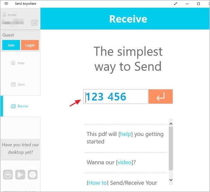 4. pc 컴퓨터에서 send anywhere 를 실행 화면에서 스마트폰에서 보낼 파일을 pc로 받을 것이므로