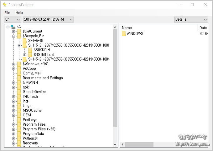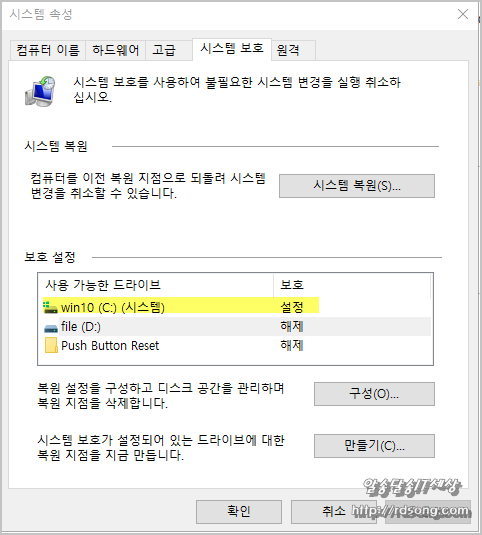 시스템 보호된 파티션 c: 드라이브만 보이며 만약 시스템이 보호되지 않은 D: 파티션은 shadow explorer 에 나타나지 않습니다 윈도우10에서 c:파티션은 보호 설정이 되어 있습니다