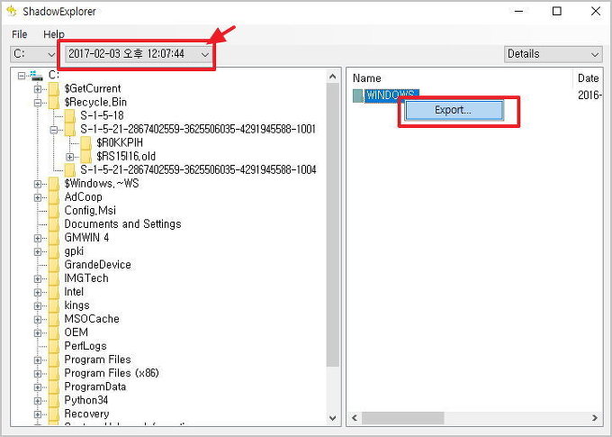 2. 파일을 복원하고 싶은 폴더 파일을 선택하고 마우스 우측을 눌러 파일을 적당한 드라이브 또는 폴더로 export (내보내기) 하여 복원을 시킵니다